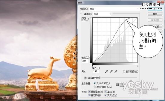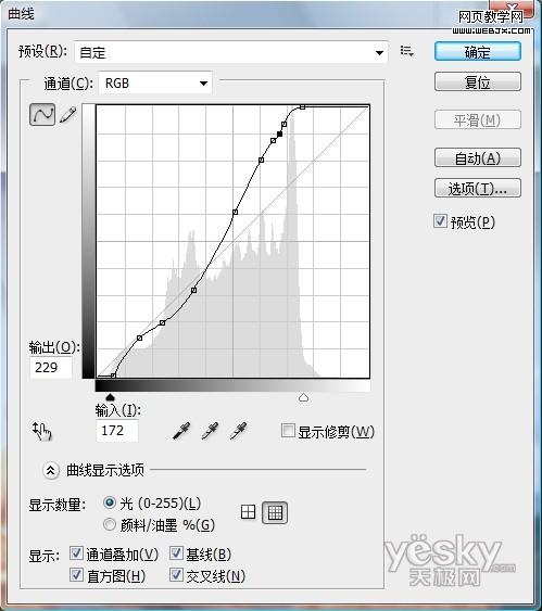 按“ctrl+m”調出曲線工具,在曲線上建立上下兩個控制點,并將曲線調整成如圖6所示的s形,我們就能夠很快地實現照片的對比度增強。