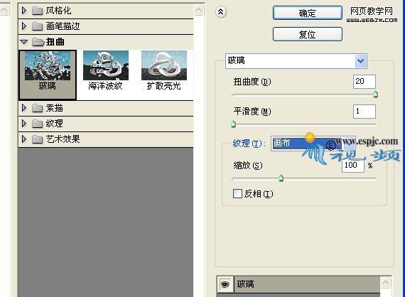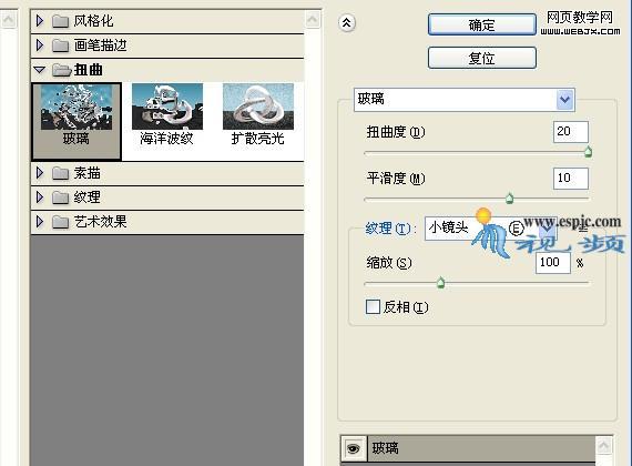 23.選擇“濾鏡”|“扭曲”|“玻璃”命令,并設置其對話框如圖37所示,得到如圖38所示效果。設置“圖層6”的混合模式為“柔光”,得到的效果圖如圖39所示。