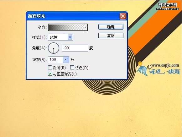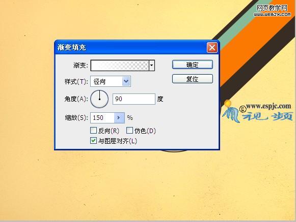11.按照9-10步的操作,使用橢圓工具在素材圖像中心繪制路徑。在進行漸變填充,得到如圖17所示效果。單擊添加圖層樣式按鈕,在彈出的菜單中選擇“描邊”命令,并設置其對話框如圖18所示。得到如圖19所示效果。(注:本步設置“漸變填充”中的漸變類型的各色標顏色值從左到右分別為#ece0ae和#ffffff。在“描邊”命令對話框,設置顏色塊的顏色值為#fb7901.)