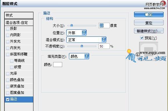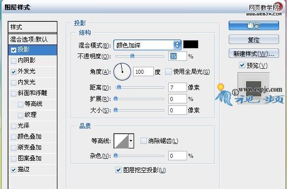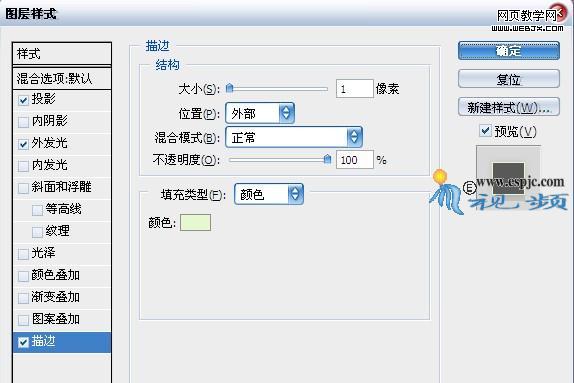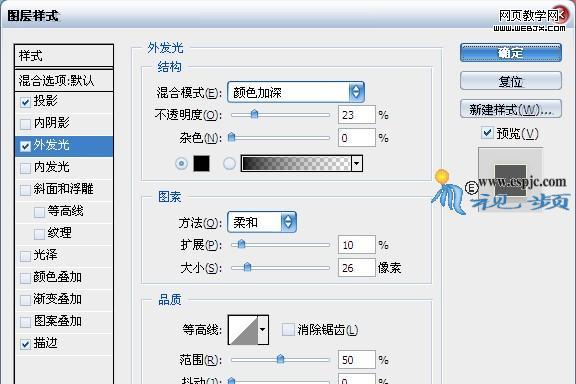 13.按照第5步的操作方法,對“形狀2”添加“投影”、“外發光”和“描邊”圖層樣式,分別設置其對話框如圖26、27、28所示。得到如圖29所示效果。