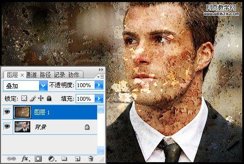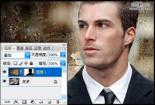 2、將紋理素材復制到人像中,并將圖層混合模式設為“疊加”。