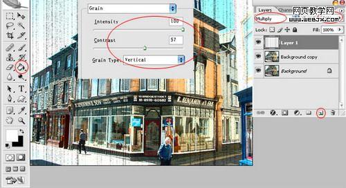 新建一層,填充白色,進行濾鏡filter > texture > grain,改變混合模式為multiply,透明度為50%