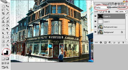 用橡皮工具抹下條紋,新建1層改前景色白色,背景色為黑色。用filter >render >clouds,再用filter > render > difference clouds,改變混合模式為overlay,透明度為40%