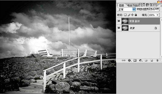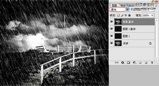 把最初復(fù)制調(diào)暗的圖層移到最上層,模式改為“柔光”