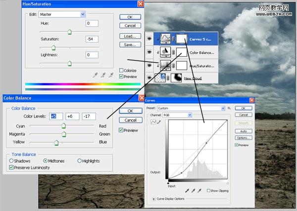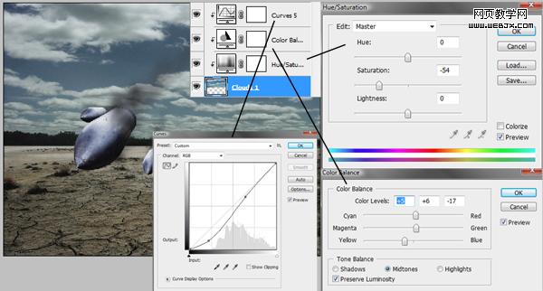 添加幾個(gè)調(diào)整層:色相/飽和度調(diào)整層、色彩平衡調(diào)整圖層、曲線調(diào)整圖層。