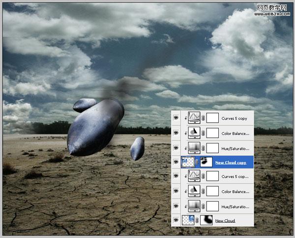 復(fù)制剛才調(diào)整好的云圖層,放到調(diào)整圖層上面,調(diào)整位置,然后創(chuàng)建蒙板,使用畫筆涂抹。
