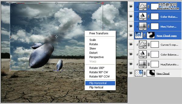 選擇云圖層和3個(gè)調(diào)整圖層,然后復(fù)制,按ctrl+t調(diào)整大小,然后右擊水平翻轉(zhuǎn)