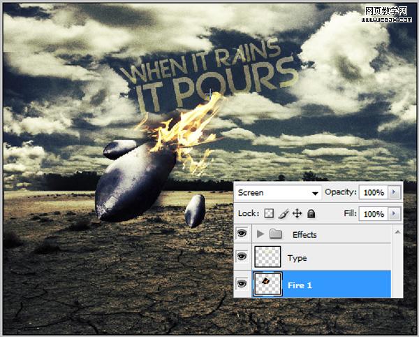 下面我們添加火效果。打開火的素材,調(diào)整大小,設(shè)置圖層模式為濾色。