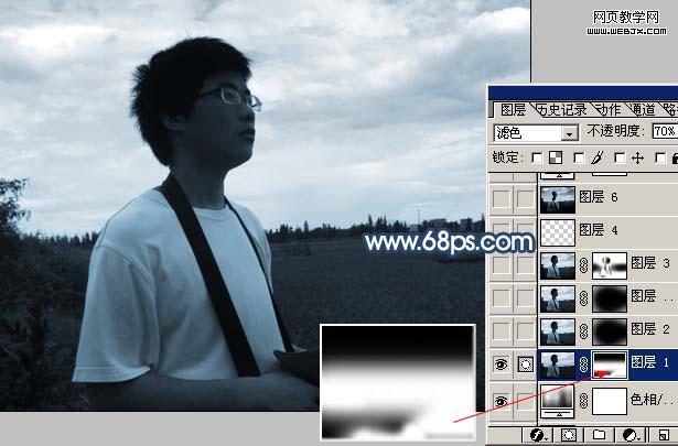 2、新建一個圖層,按ctrl + alt + shift + e 蓋印圖層,圖層混合模式改為“濾色”,圖層不透明度改為:70%,加上圖層蒙版,只保留中間部分,其它部分用黑色畫筆擦掉,如圖2。