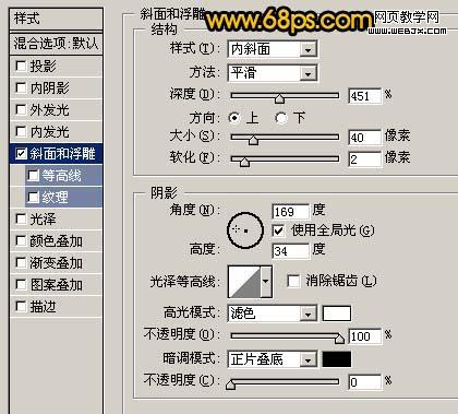 2、雙圖層面板文字圖層縮略圖調出圖層樣式,選擇斜面和浮雕,參數設置如圖2,效果如圖3。數值只供參考,實際數據需要根據文字大小設定。
