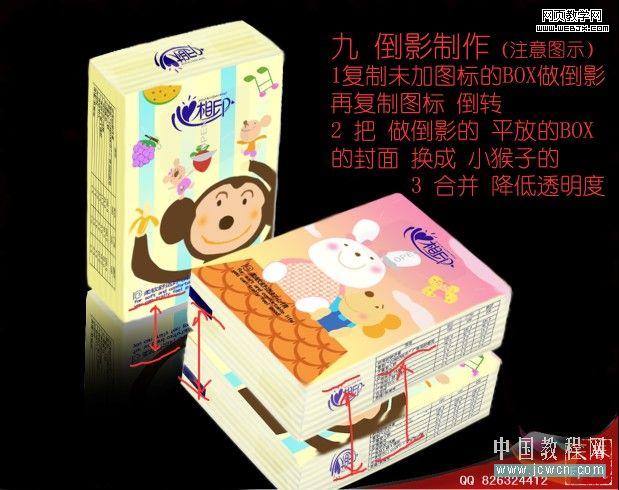 10、倒影制作:復制未加圖標的盒子做倒影,再復制圖標倒轉。把做倒影的平放盒子的封面換成小猴子的。合并后適當降低透明度,完成最終效果。