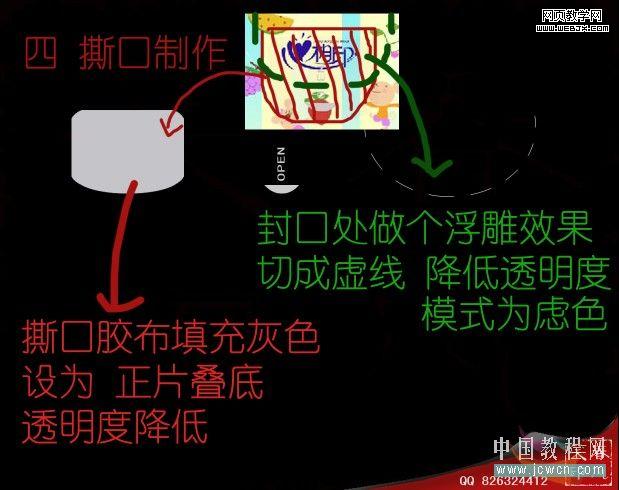 4、撕口制作:封口處做個浮雕效果,切成虛線,降低透明度,模式為濾色。撕口膠布填充灰色,混合模式改為“正片疊底”,適當降低透明度。