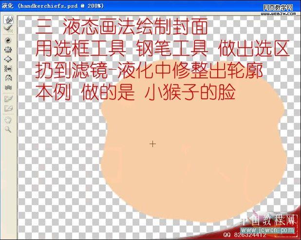3、液態畫法繪制出封面。用選框工具機鋼筆工具做出選區,然后用液化濾鏡(濾鏡 > 液化)中修正出輪廓,本例做的是小猴子的臉。