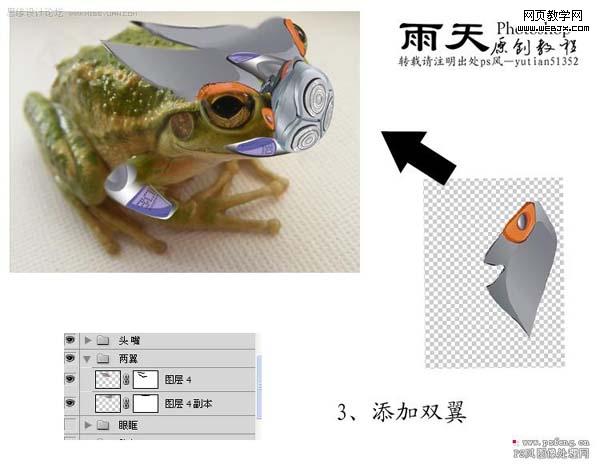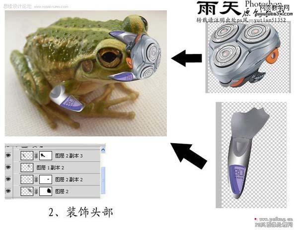 2、開始裝飾頭部:把胡須刀的頂部部分用套索工具摳出來,然后復制進來,貼到青蛙的嘴部位置,適當的變形處理,同樣的方法勾出下圖右下圖形放到青蛙的嘴部邊緣,效果如下圖。