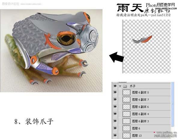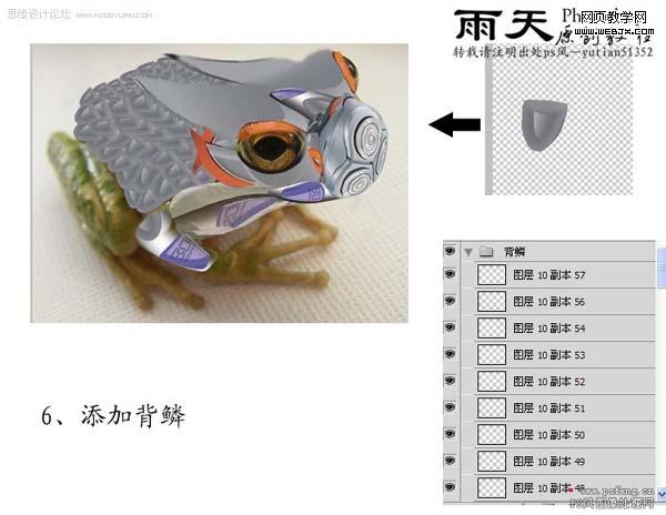 6、同樣的方法添加青蛙背部的鱗片,鱗片并不是規則的排列,需要不斷調整方向和大小。