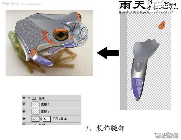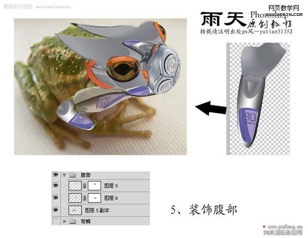 3、添加背部紋理:用鋼筆工具勾出胡須刀右上部位置,如下圖。然后貼到青蛙的背上,適當調整好位置和角度。一些多出的部分可以加上圖層蒙版用黑色畫筆擦掉,效果如下圖。