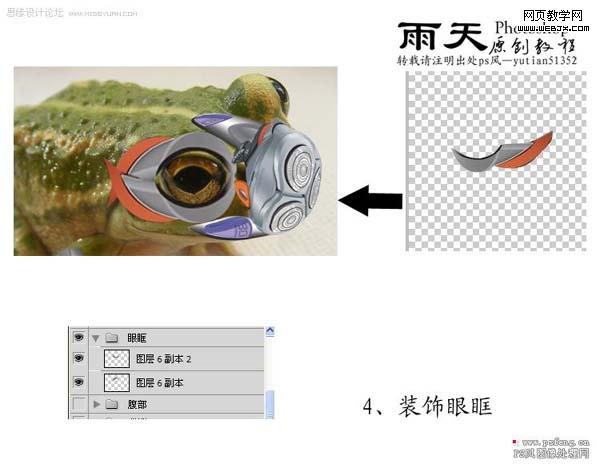 4、裝飾眼眶:用鋼筆工具勾出下圖所示的區塊,拖進來放到青蛙眼睛上面,然后適當調整好位置,下眼眶部分的可直接復制。