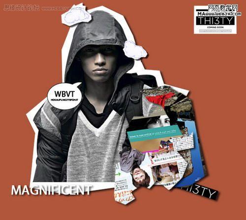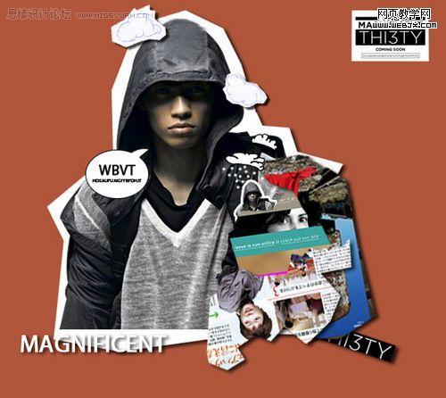 第4步,找些雜志頁面把它們不規則的扣下來,放入文件中,放在人物右上面,并加陰影