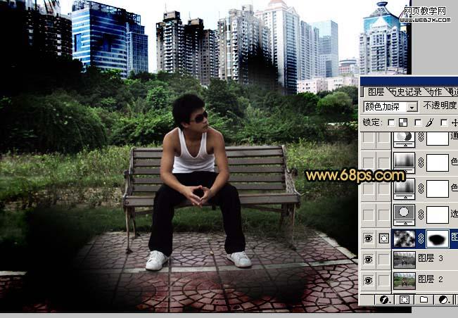 2、新建一個圖層,按字母“d”,把前背景顏色恢復到默認的黑白,然后執行:濾鏡 > 渲染 > 云彩,確定后按ctrl + alt + f 加強一下,效果如圖2,然后把圖層混合模式改為“顏色加深”,加上圖層蒙版,用黑色畫筆把中間部分擦出來,效果如圖3。
