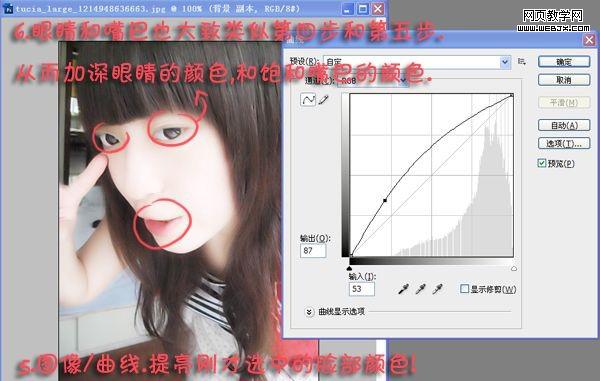5.執行圖像>調整>曲線,眼睛和嘴巴也執行第4、5步的操作