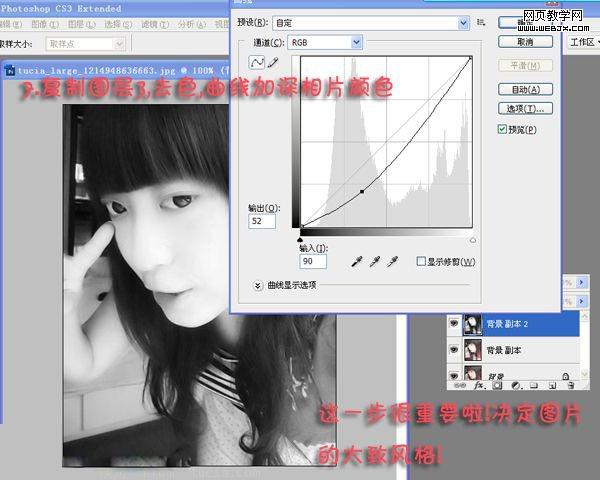 6.按ctrl+j復制背景副本得到背景副本2,按ctrl+shift+u隊背景副本2去色,再調整一下曲線如圖