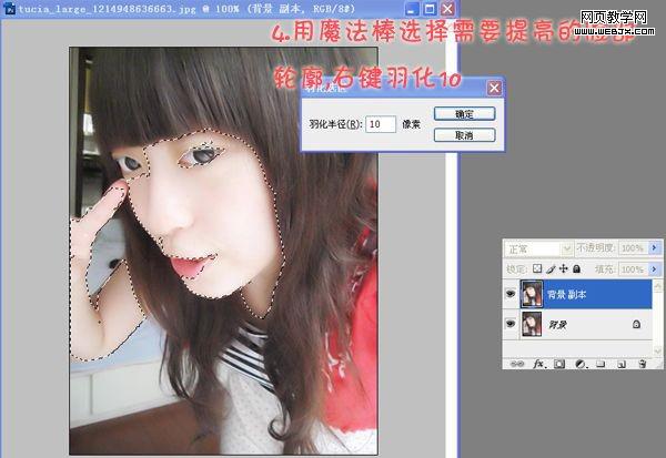 4.用魔術棒工具選擇臉部要提亮的部位,按住shift可以多選,然后右鍵羽化10