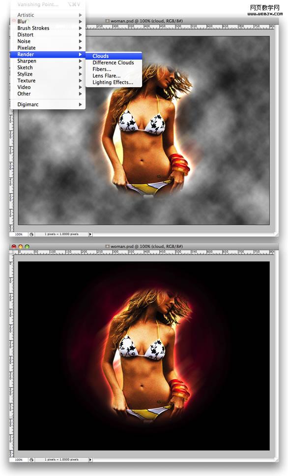 在模糊層的后面創(chuàng)建一個(gè)層,按d鍵恢復(fù)前景和背景色為黑白默認(rèn)。 然后進(jìn)入濾鏡 “ 渲染”-“云彩”。更改圖層模式為顏色減淡。