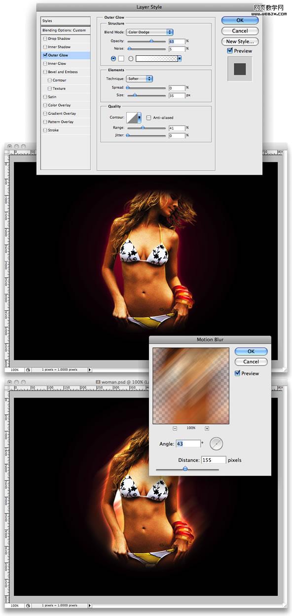 雙擊女孩的層,打開圖層樣式對(duì)話框,選擇外發(fā)光,對(duì)于混合模式下使用顏色減淡,大小為35px。確定后ctrl+j復(fù)制這一層并轉(zhuǎn)到濾鏡 “> 模糊”運(yùn)動(dòng)模糊。使用距離為43和155。角 。請(qǐng)將此模糊層調(diào)整到正常層后面。