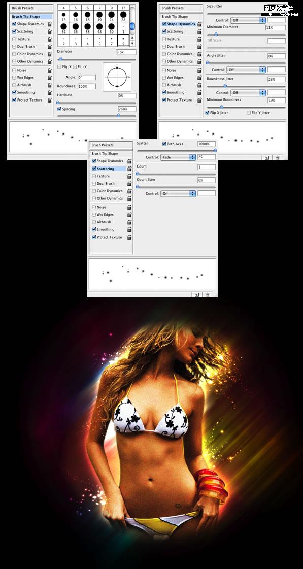 接下來就可以充分發(fā)揮你的筆刷功力了,打開筆刷面板,選擇一個(gè)模糊圓形筆刷,然后利用筆刷面板中的間距 動(dòng)態(tài)大小等調(diào)整出還看的筆刷,我們用白色在畫布上隨意刷即可! 最后就可以得到令您滿意的效果!