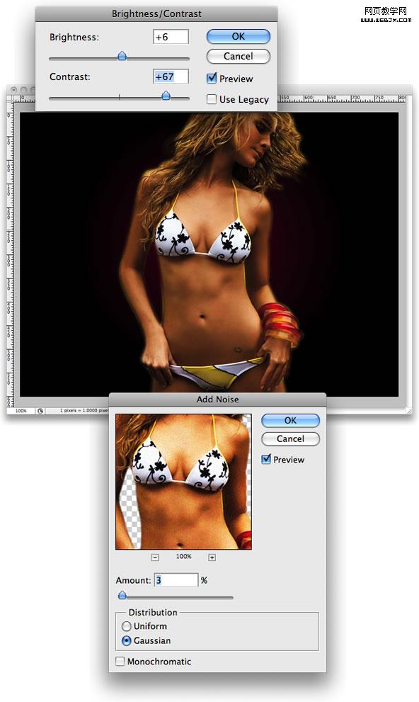現(xiàn)在我們要提高美女的對(duì)比度,看起來皮膚更有質(zhì)感一些,我們打開“亮度/對(duì)比度” , 然后添加一點(diǎn)的雜點(diǎn)。 濾鏡>雜點(diǎn)>添加雜點(diǎn) ;