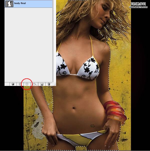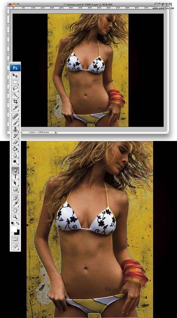 好,我們選擇選擇鋼筆工具(p),利用邪惡的線條將比基尼女孩的身體四周游走一邊!如圖效果: