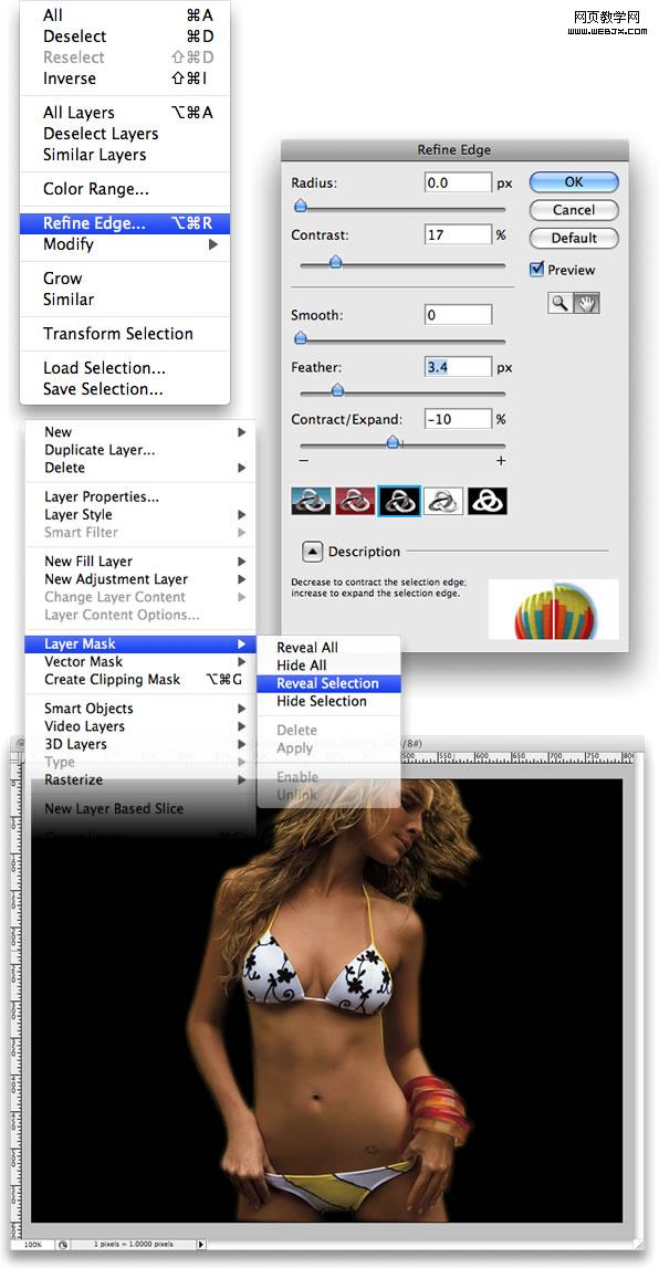 回到圖層面板 ,選擇比基尼女孩的圖層,點(diǎn)擊“圖層”-“調(diào)整邊緣”,這時(shí)候彈出調(diào)整邊緣對(duì)話框,其實(shí)這個(gè)功能就相當(dāng)于高級(jí)羽化了,拖動(dòng)滑塊至如圖所示,我們看到畫布上的邊緣變得有羽化效果了!確定!返回圖層面板點(diǎn)擊“添加蒙板”按鈕!