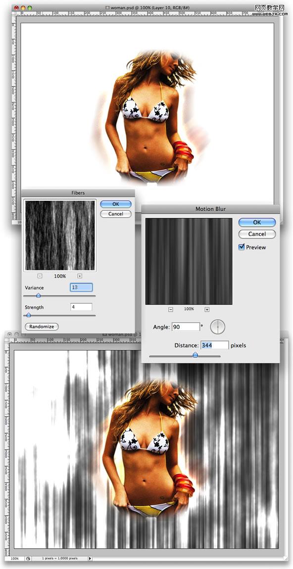 在云層底下再新建一個(gè)圖層。然后選擇濾鏡 “渲染”——“纖維...”使用差異:13強(qiáng)度:4,然后再選擇濾鏡 “模糊”——“運(yùn)動(dòng)模糊”改變角度為90度,大小為344 。