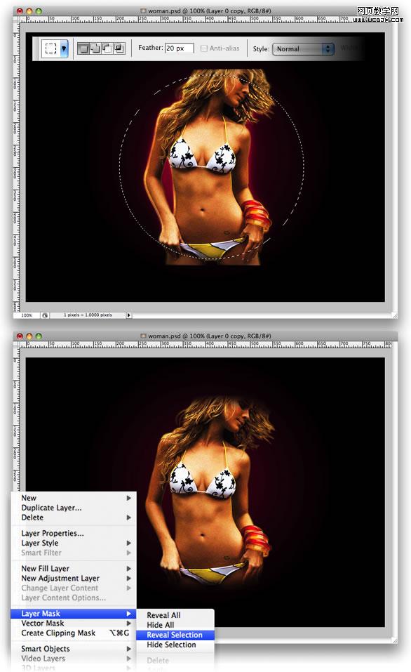 選擇美女層,然后用圓形選區(qū)工具(m),如下圖框選出螞蟻線,按alt+ctrl+a 出來羽化選項(xiàng),設(shè)為30px羽化值!同樣選擇“圖層”>“圖層蒙板”>“顯示選區(qū)”得到如下效果