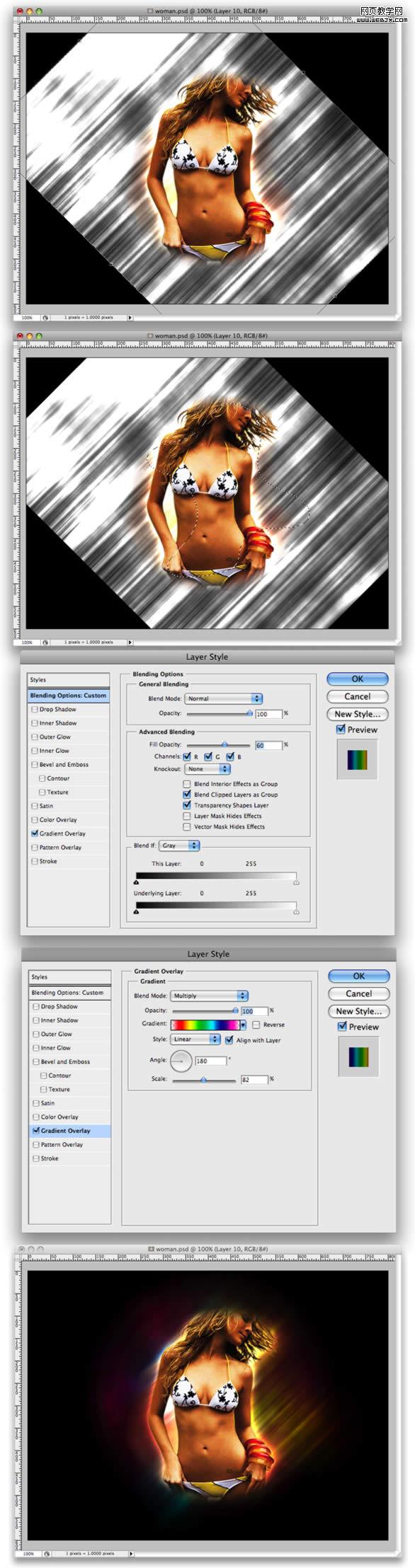 旋轉(zhuǎn)纖維層如圖所示,然后選擇套索工具,并創(chuàng)建類似底下的選區(qū)。后來有更多的時(shí)間去“圖層”——“圖層蒙版”——“顯示選區(qū)”。之后,雙擊圖層打開圖層樣式對(duì)話框。在圖層樣式的第一個(gè)屏幕上設(shè)置填充不透明度為60%,然后添加一個(gè)漸變疊加 ,用七彩虹的顏色進(jìn)行疊加。