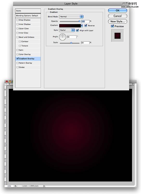 創(chuàng)建一個(gè)新的畫布,我的是800x600像素。之后,在背景層上雙擊打開圖層樣式對(duì)話框,并添加一個(gè)漸變疊加。選擇徑向方式,然后使用的顏色:暗紅色——黑色 (中心是暗紅 四周是黑色),如圖所示: