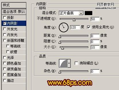 9、雙擊圖層調出圖層樣式,選擇內陰影,參數設置如圖14,確定后把圖岑混合模式改為“強光”,效果如圖15。