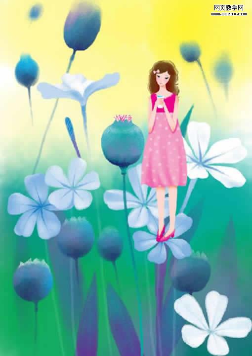 下還是想在繼續加一個元素增加畫面的層次和空間,于是又加了一束花放在人物前邊,這樣畫面多了一個前后關系,其他花苞加的是白須,不搶鏡頭,這樣視覺集中在女孩身上,到這里這幅插畫就算完工了。