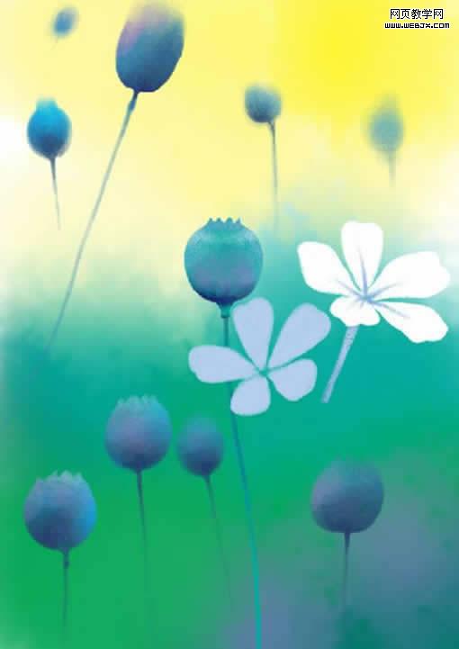 再單獨建立一個圖層,把畫筆調小,畫筆的大小可以通過鍵盤上的左右中括號 []來控制,[左中括號是畫筆變小,]右中括號是畫筆增大。用適當大小的畫筆以色塊的方式涂出一個花苞,在調小畫筆畫出花莖,顏色由自己愛好所定,近似色,對比色都可以,要的是最后的效果。這里我選擇了近似色。