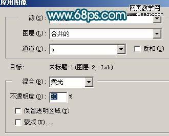 7、新建一個圖層,按ctrl + alt + shift + e 蓋印圖層,選擇菜單:圖像 > 模式 > lab顏色,選擇不合拼。然后執行:圖像 > 應用圖像,參數設置如圖12,確定后選擇菜單:圖像 > 模式 > rgb顏色,選擇不合拼,效果如圖13。