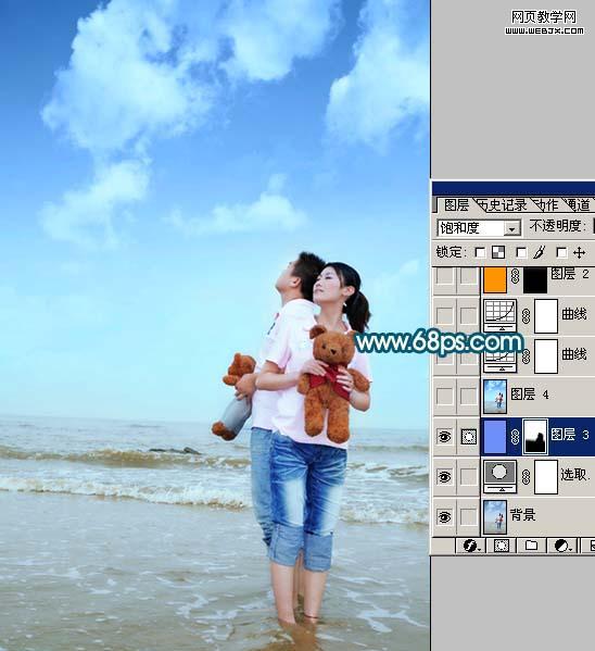 2、新建一個圖層,填充顏色:#6c90f8,圖層混合模式改為“飽和度”,加上圖層蒙版,用黑色畫筆把人物及海水部分涂出來,效果如下圖。