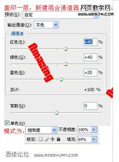 4、新建一個圖層按ctrl + alt + shift + e 蓋印圖層,然后創建通道混合器調整圖層,對灰色進行調整,參數及效果如下圖。