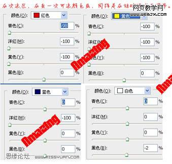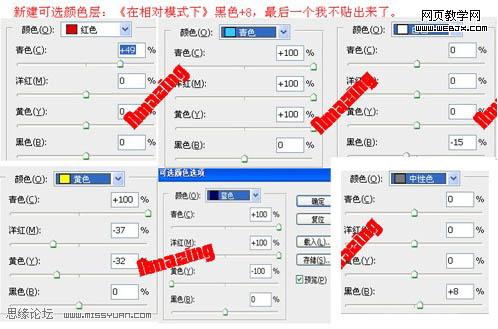 2、創建可選顏色調整圖層,都是在相對模式下調整,參數及效果如下圖。