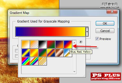 下面我們給陸地上也添加一些顏色。在所有圖層頂端新建一個圖像調整層。漸變映射。使用藍到紅到黃的漸變。