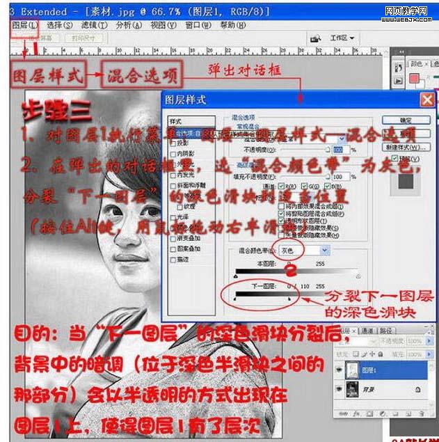 3、對(duì)圖層1執(zhí)行:圖層 > 圖層樣式 > 混合選項(xiàng)。在彈出對(duì)話框,選“混合顏色帶”為灰色。分裂下一圖層的神色滑塊到適當(dāng)位置(方法:按住“alt”鍵,用鼠標(biāo)拖動(dòng)右半滑塊)。