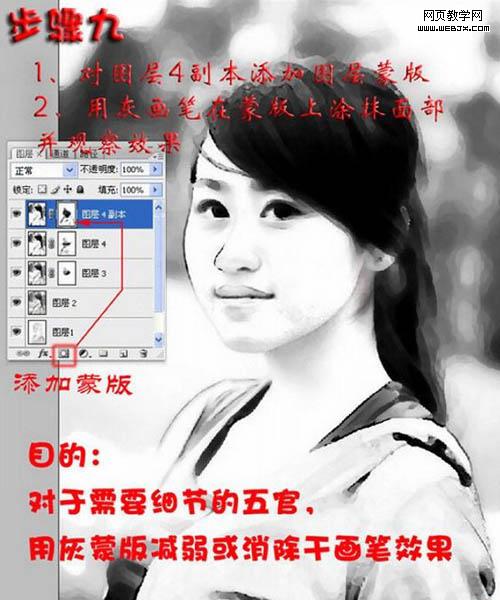 9、對(duì)圖層4副本添加圖層蒙版,用灰色畫(huà)筆在蒙版上涂抹面部,并觀察效果。