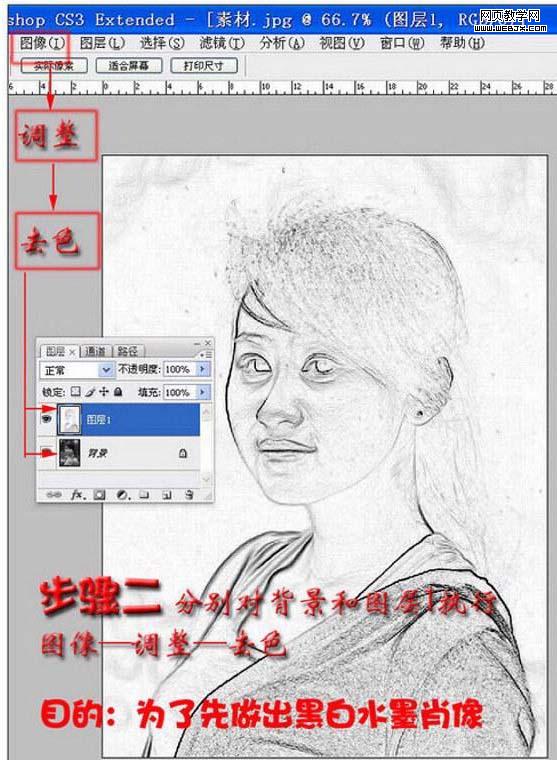 2、分別對(duì)背景和圖層1執(zhí)行:圖像 > 調(diào)整 > 去色。目的是為了先做出黑白水墨肖像。