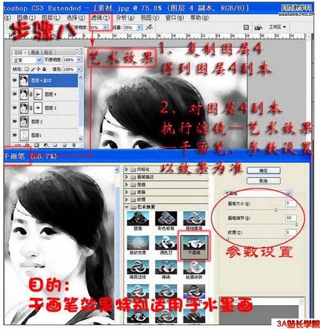 8、復(fù)制圖層4得到圖層4副本,對(duì)圖層4副本執(zhí)行:濾鏡 > 藝術(shù)效果 > 干筆畫(huà),參數(shù)設(shè)置如下圖。