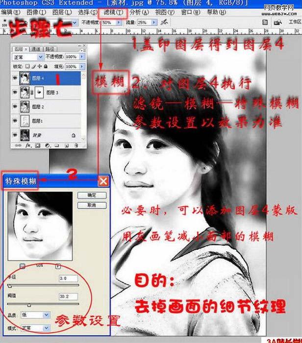 7、新建一個(gè)圖層蓋印圖層,得到圖層4,對(duì)圖層4執(zhí)行:濾鏡 > 模糊 > 特殊模糊,參數(shù)一效果為準(zhǔn)。