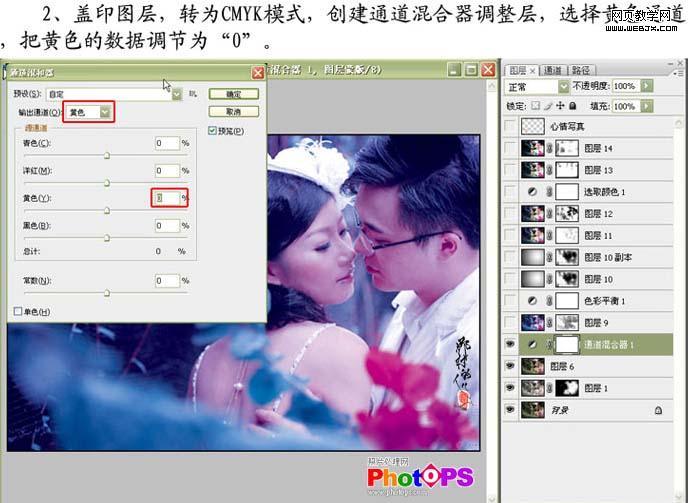 2、新建一個圖層,按ctrl + alt + shift + e 蓋印圖層,選擇菜單:圖像 > 模式 > cmyk 顏色,確定后創(chuàng)建通道混合器調(diào)整圖層,選擇黃色調(diào)整,參數(shù)設(shè)置如下圖。